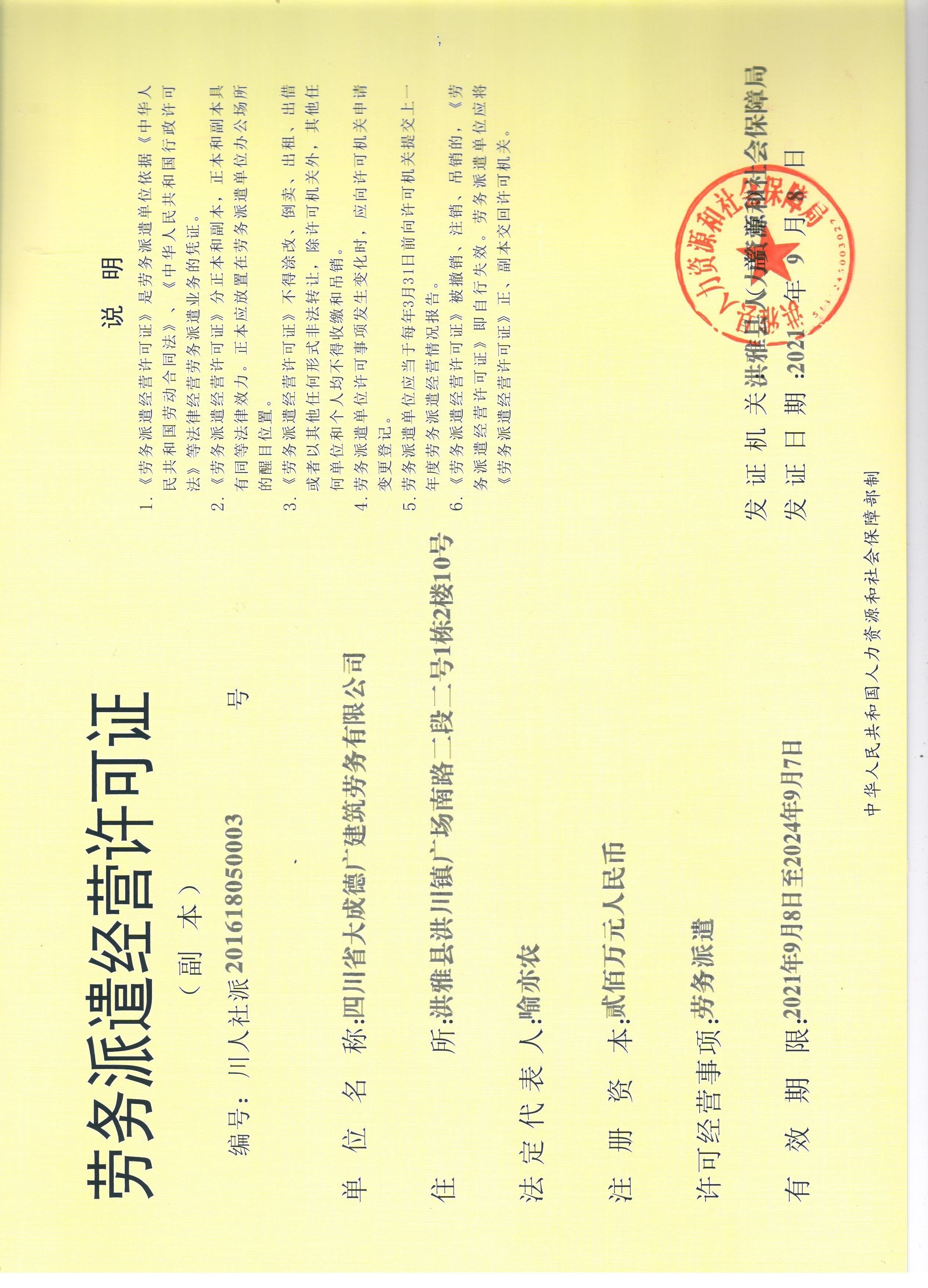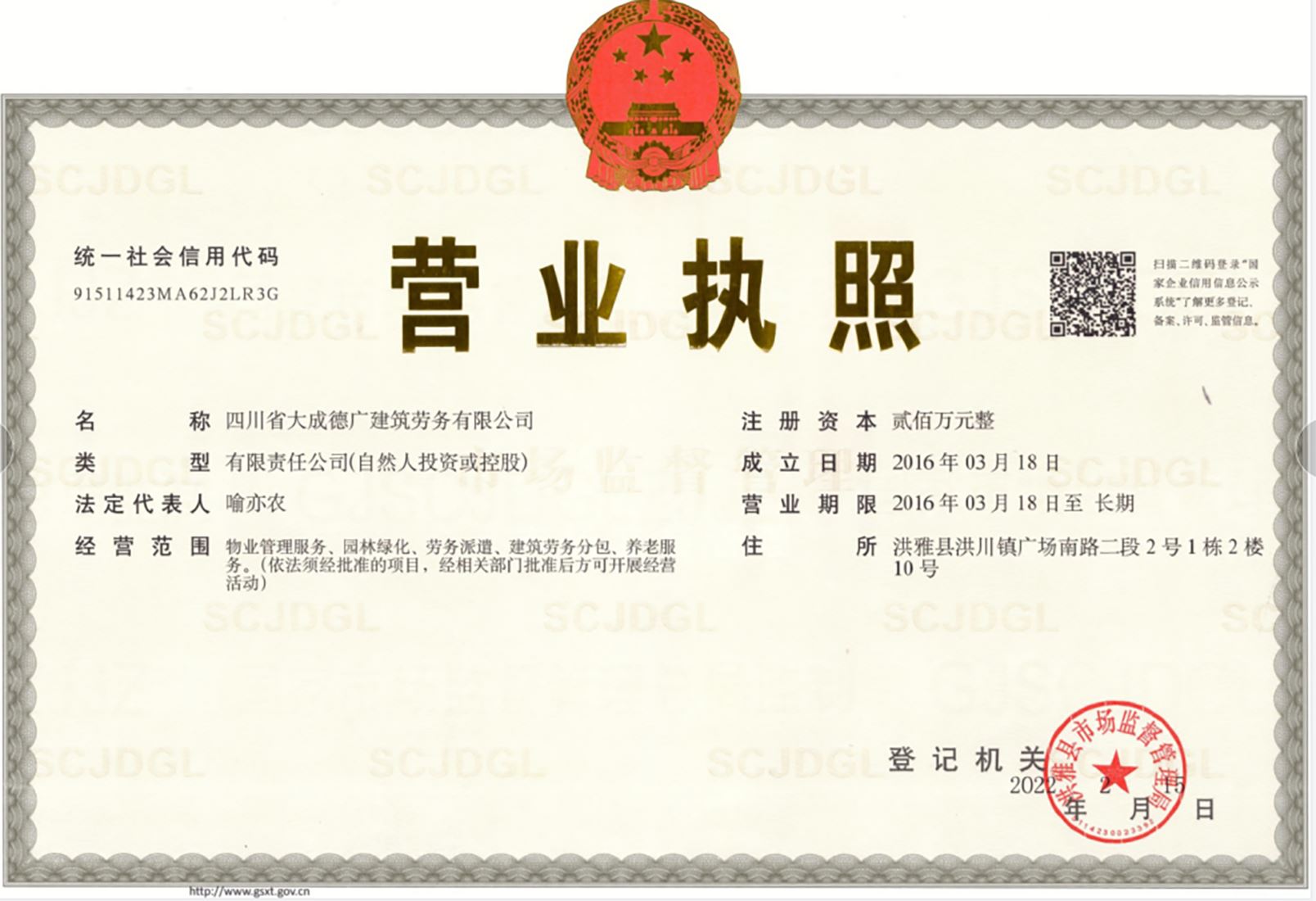 四川省大成德广建筑劳务有限公司(以下简称“公司”),成立于2016年,注册资本200万,专注于劳务派遣、建筑劳务不分等级;现公司主营业务如下:750KV及以下变电站及800KV换流站电气设备安装、检修维护、调试;变电站电气设备带电检测技术服务、变电站技术改造、扩容、调试及技术服务;220KV及以下电力线路施工;水力发电站检修调试、安装维护;光伏发电站检修调试、安装维护;通信线路及设备施工与维护;局域网组建、小区楼宇弱电配套系统、智慧信息化的设计施工与维护、以及土建装修施工、市政施工、园林绿化等专业领域。目前公司本部员工50余人,平均学历大专以上,人力资源、法务、税务、电力、通信等专业人才率为100%。公司本着“依法依规、创新务实、专业专注、极致服务”的宗旨,致力于打造一支有趣而专业的团队。