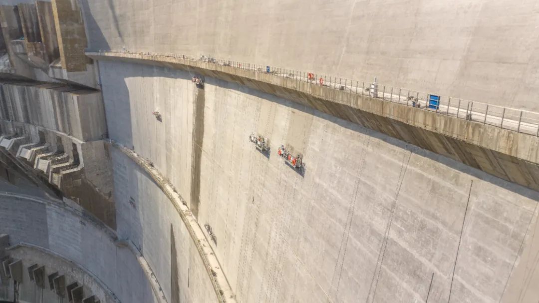 ▲ 白鹤滩水电站大坝工程坝面混凝土保护剂施工现场